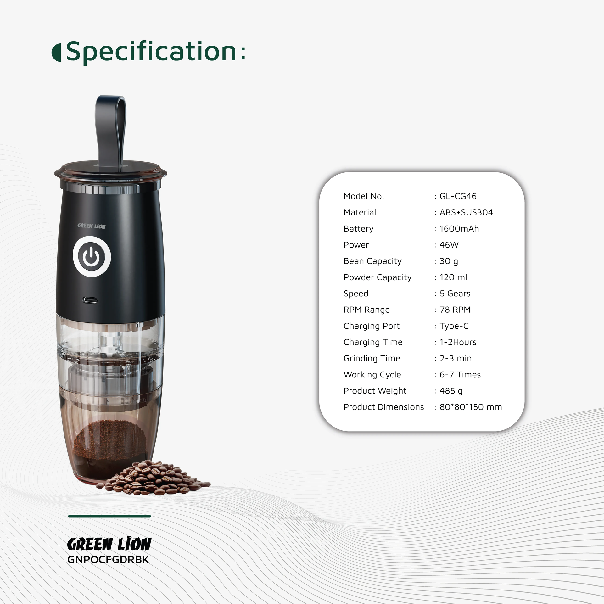 The Green Lion GL-CG46 combines power, portability, and precision to deliver the perfect grind every time.
