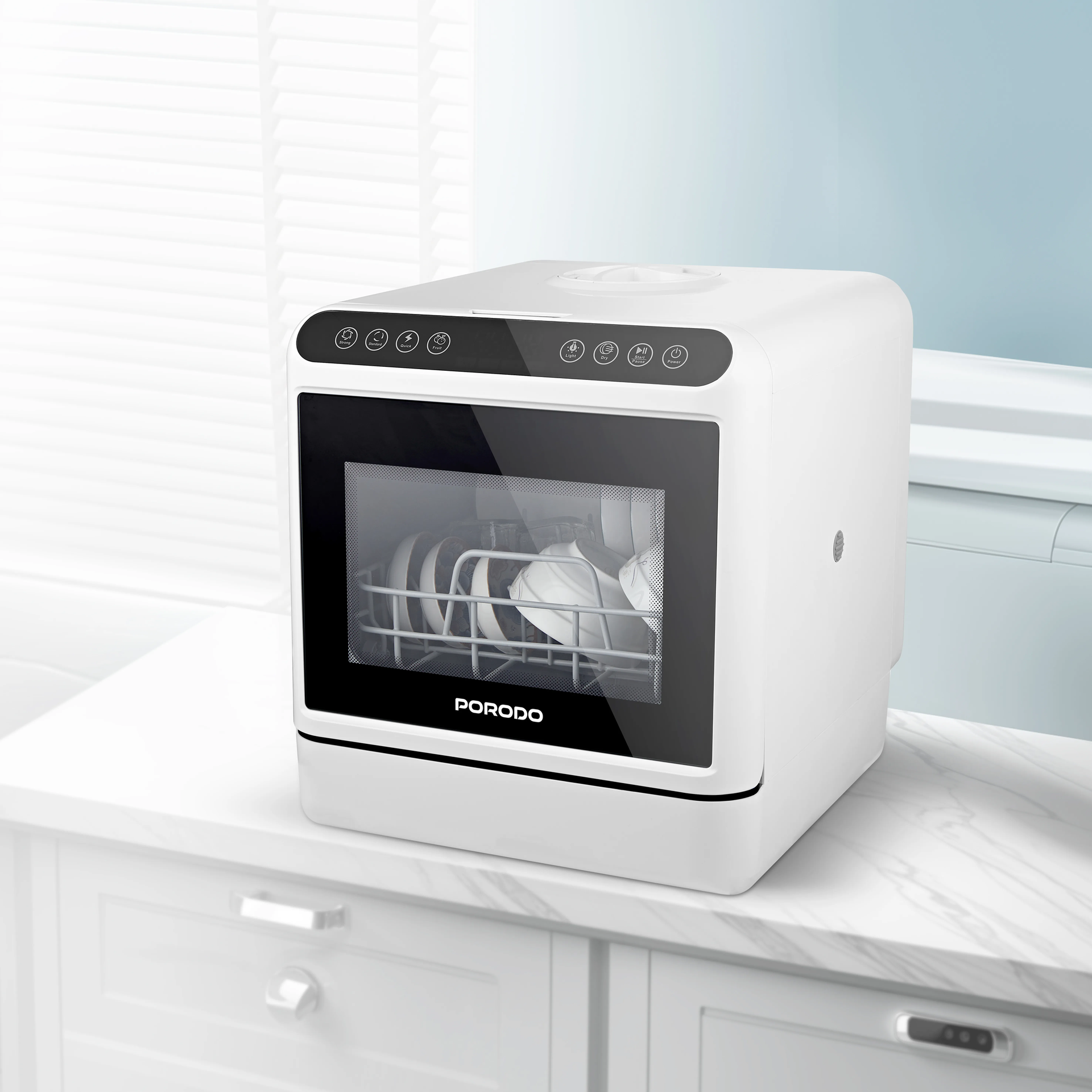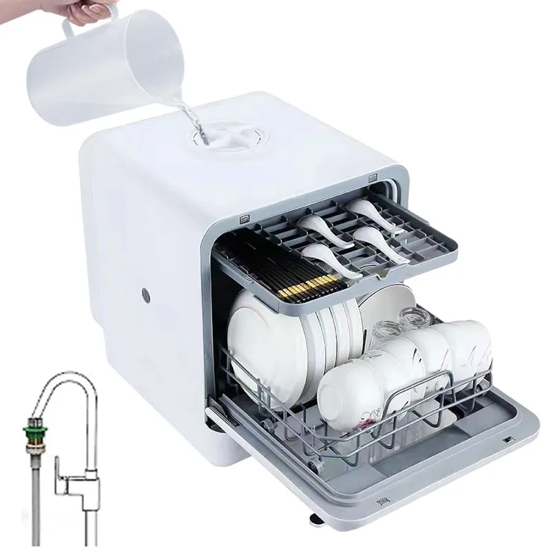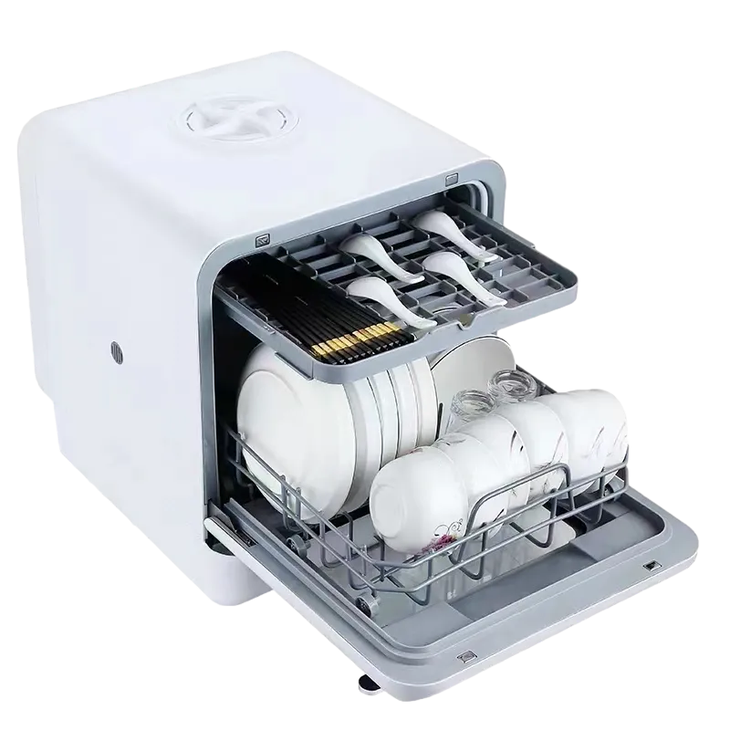 A compact and modern countertop dishwasher designed for convenience and efficiency. It features a dual-layer rack system for organizing plates, bowls, cups, and utensils neatly. The upper rack accommodates cutlery and spoons, while the lower rack fits dishes and glasses securely. With a sleek white and gray finish, it’s perfect for small kitchens, apartments, or offices, offering powerful cleaning performance while saving water and energy.